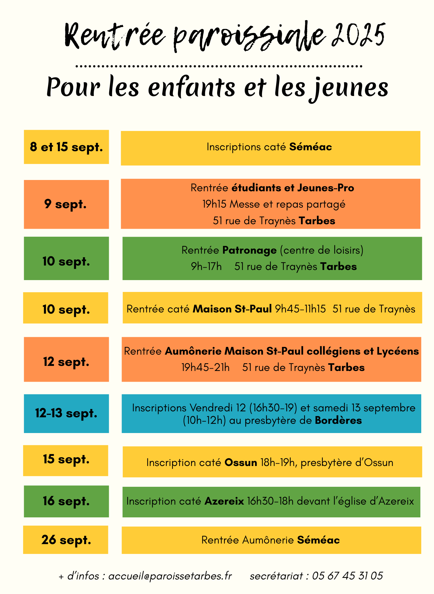 - Pour les enfants de moins de 3 ans, en âge scolaire, collégiens et lycéens : contacter le secrétariat de la paroisse par téléphone ou par mail